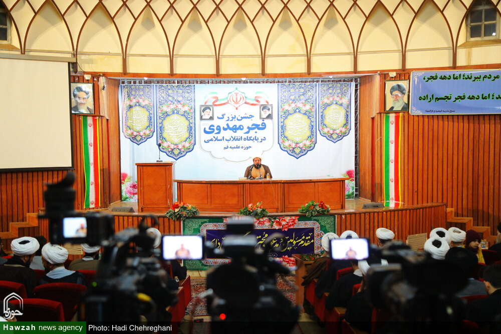 حجتالاسلام والمسلمین حمید ملکی قائم مقام مدیر حوزه علمیه قم در این مراسم طی سخنانی با تبریک اعیاد شعبانیه، نکاتی پیرامون آثار و برکات پیروزی انقلاب اسلامی ارائه کرد و گفت: دشمنان انقلاب اسلامی با تبلیغات وسیع رسانهای که در این امر تخصص هم دارند و میتوانند جای جلاد و شهید را عوض کنند؛ فضای قبل از انقلاب را فضای ارزانی و وفور نعمت توصیف میکنند و با پمپاژ تبلیغاتی مسموم و در قالب ساخت جوک و امثال آن، دروغهای خود را به جوانان ما القا میکنند.